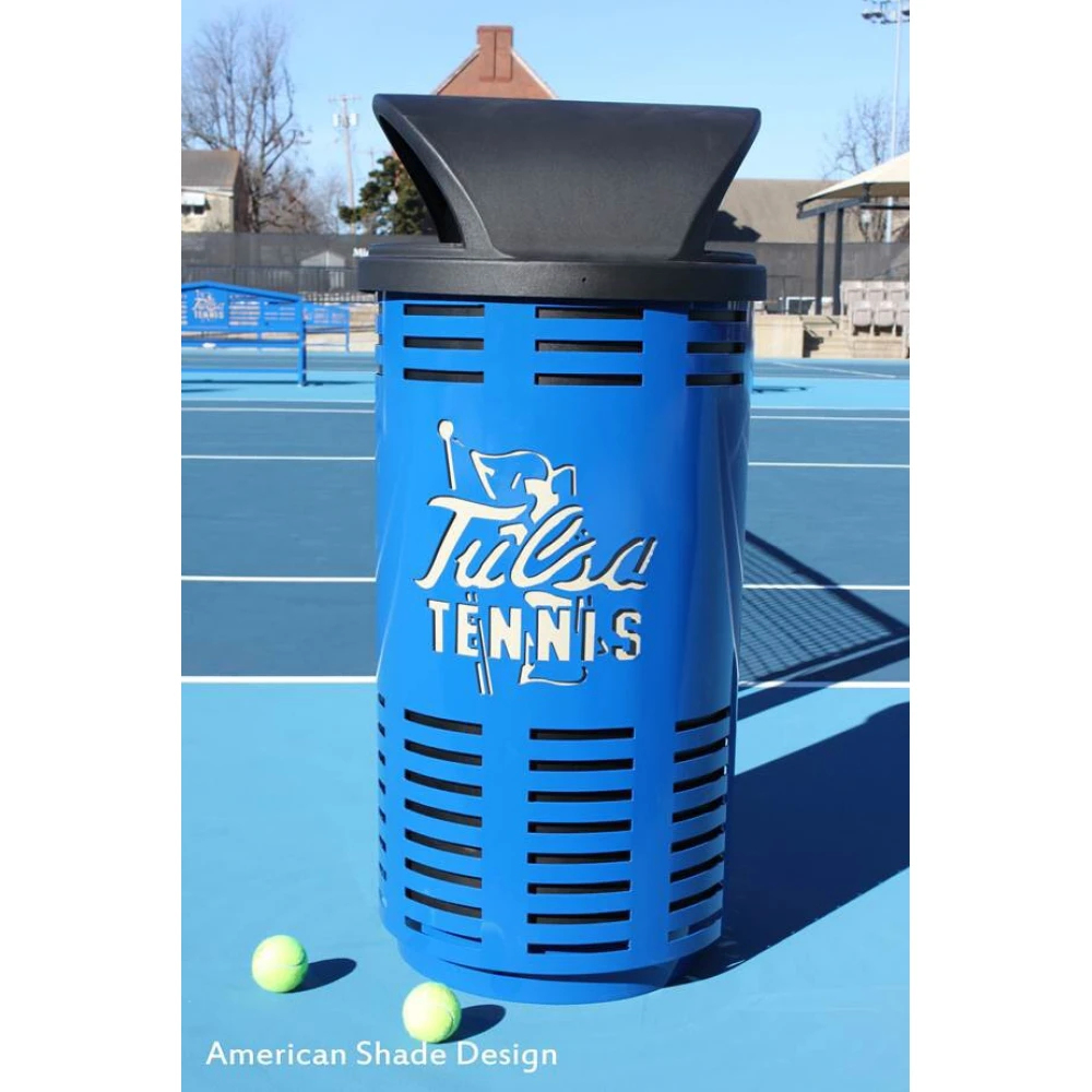 Custom Designer Logo Stadium Trash Container, with your custom Logo laser cut into the metal on two sides.